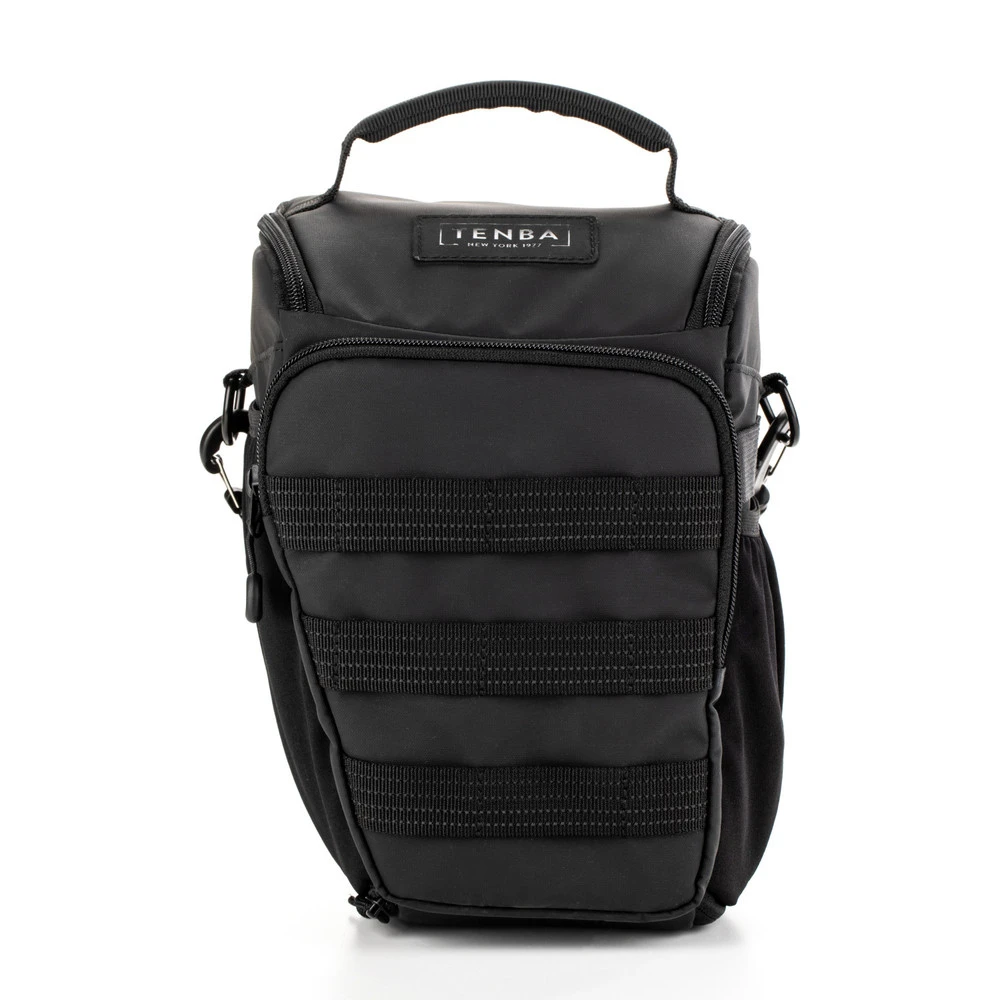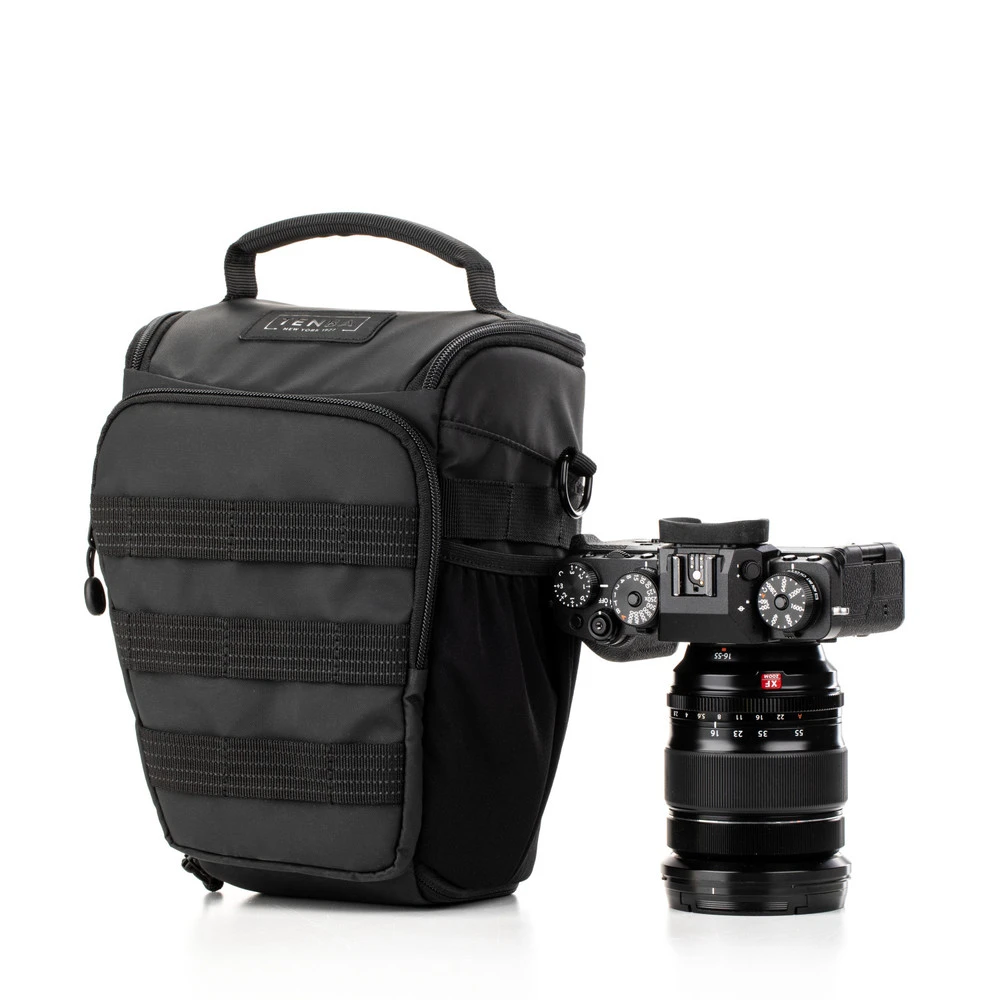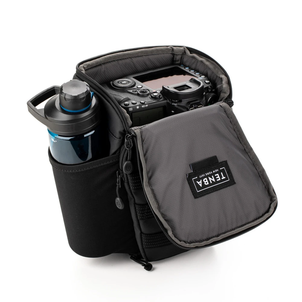 Tenba’s tactical Axis bags were inspired by the ultra-durable bags we’ve made for the military throughout our 40+ year history. The 4L Top Loader will fit a Mirrorless or DSLR camera with an attached lens up to 6 inches (15 cm) long, like a 24-70mm 2.8, and it can be expanded at the bottom to fit a lens as long as a 70-200mm 2.8. It also fits a DJI Mavic and other compact drones. MOLLE webbing allows limitless expandability with Tenba Tools, such as Lens Capsules, Battery Pouches and Memory Card Wallets, as well as a multitude of military-standard pouches and accessories. This is the first camera bag to include a hidden pocket compatible with an Apple AirTag or Tile Bluetooth Tracker. The lid opens away from your body, so it doesn’t interfere with removing gear quickly.