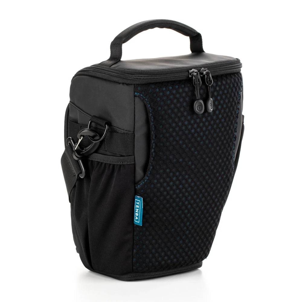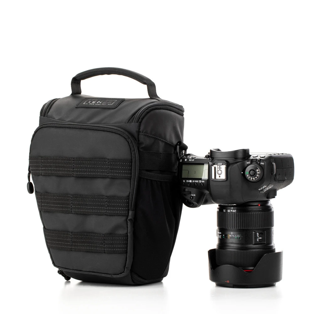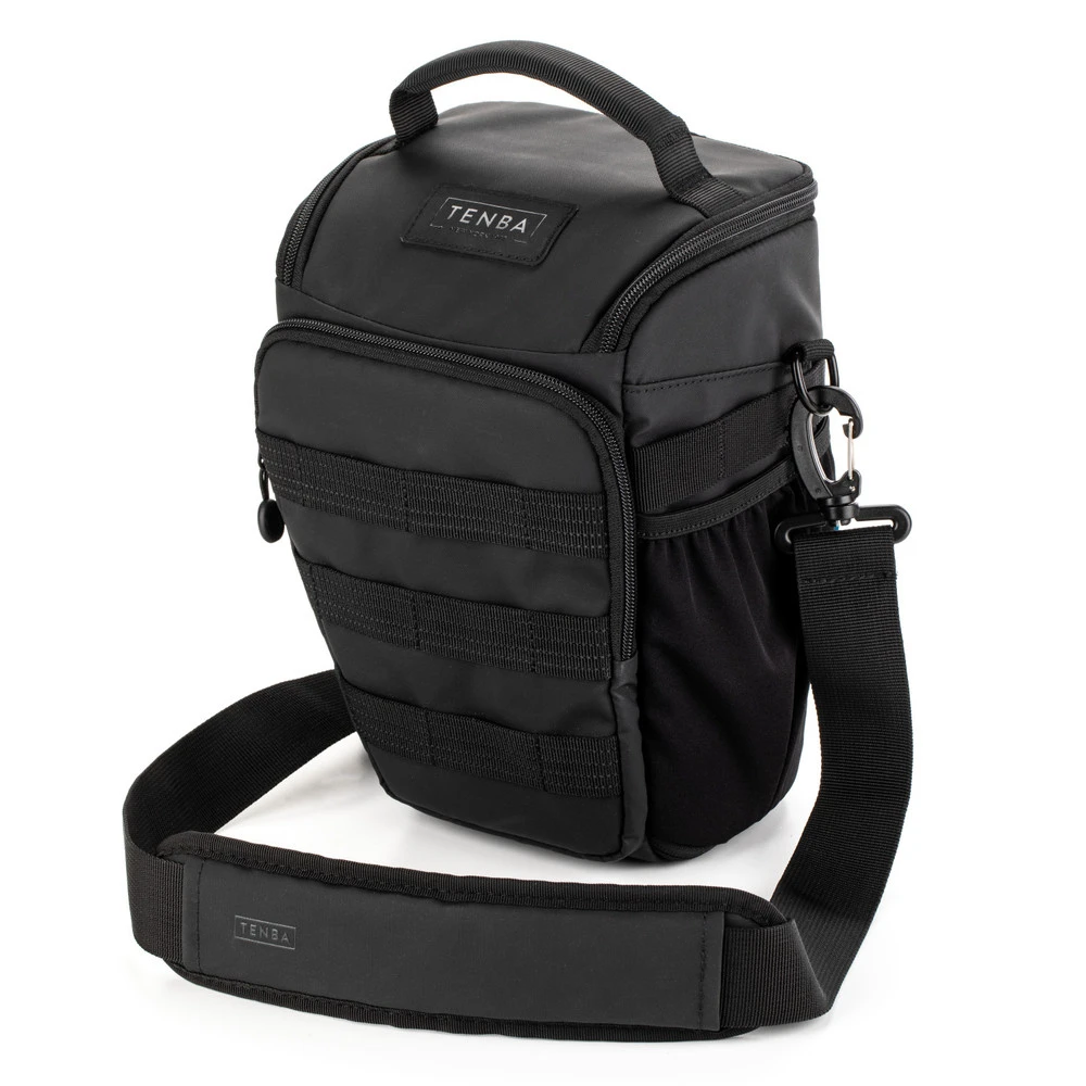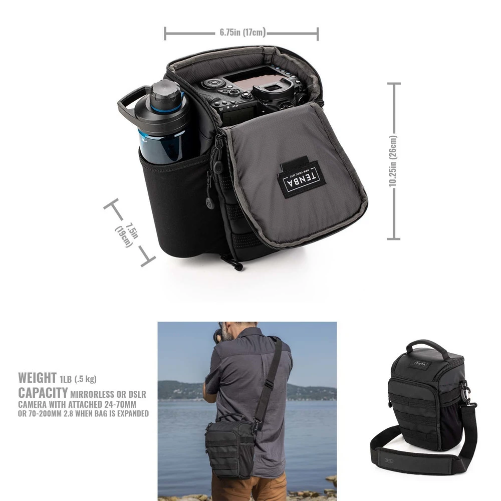 Tenba’s tactical Axis bags were inspired by the ultra-durable bags we’ve made for the military throughout our 40+ year history. The 4L Top Loader will fit a Mirrorless or DSLR camera with an attached lens up to 6 inches (15 cm) long, like a 24-70mm 2.8, and it can be expanded at the bottom to fit a lens as long as a 70-200mm 2.8. It also fits a DJI Mavic and other compact drones. MOLLE webbing allows limitless expandability with Tenba Tools, such as Lens Capsules, Battery Pouches and Memory Card Wallets, as well as a multitude of military-standard pouches and accessories. This is the first camera bag to include a hidden pocket compatible with an Apple AirTag or Tile Bluetooth Tracker. The lid opens away from your body, so it doesn’t interfere with removing gear quickly.
