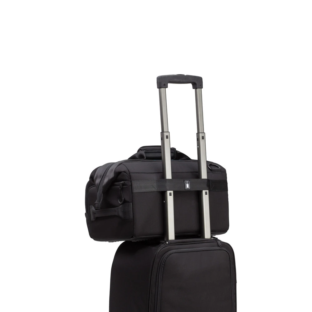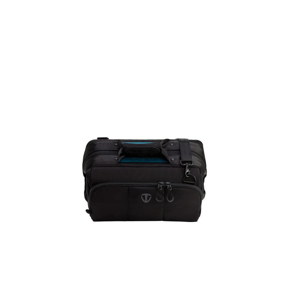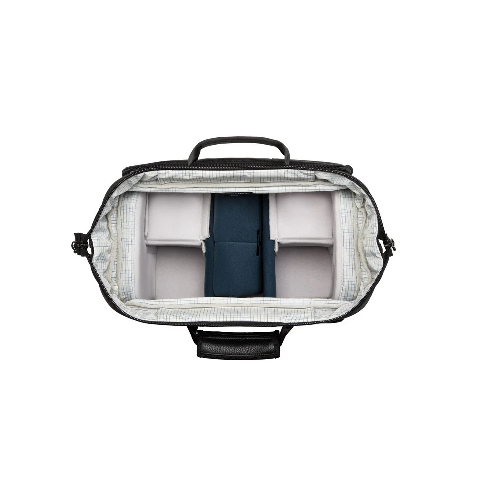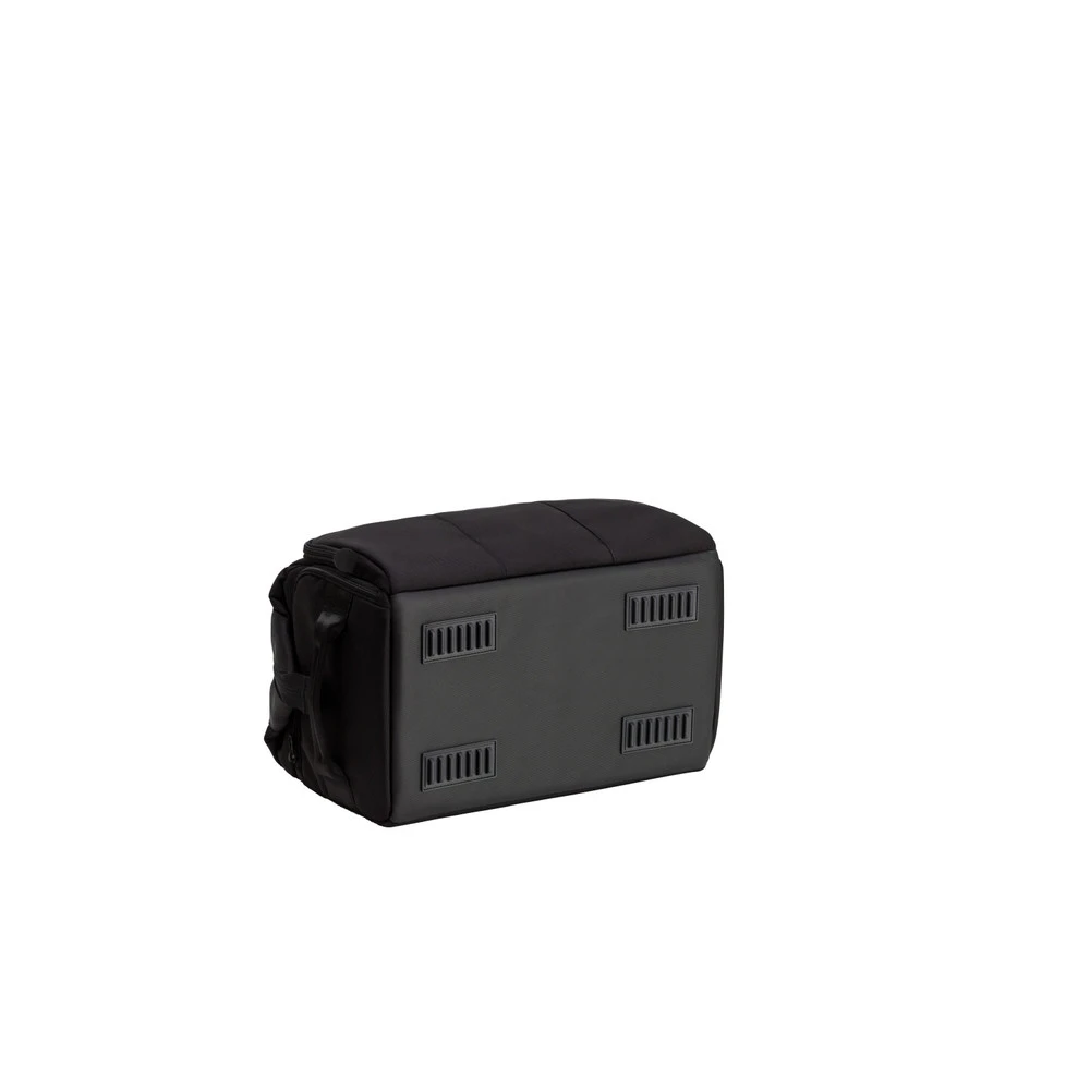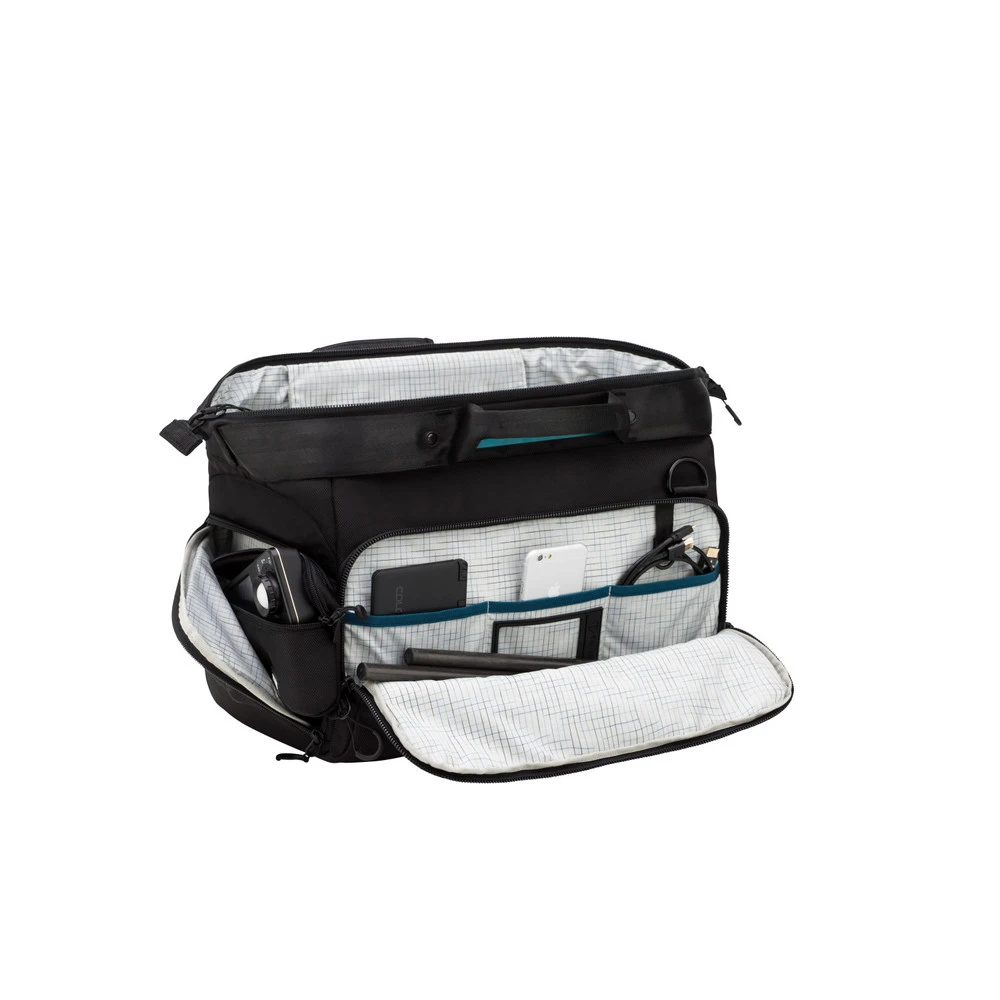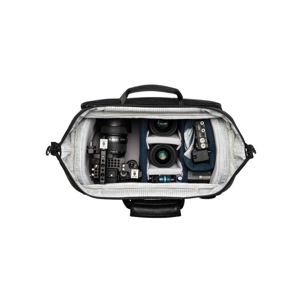 The Cineluxe Shoulder Bag 16 fits mirrorless or DSLR cameras with 3-5 lenses, or professional camcorders and compact cine cameras. It meets international carry-on regulations, and it will even fit under the seat of an airplane. This bag is compact, lightweight and easy to carry, and its interior height allows cameras to be stored with mics and other additional gear attached.