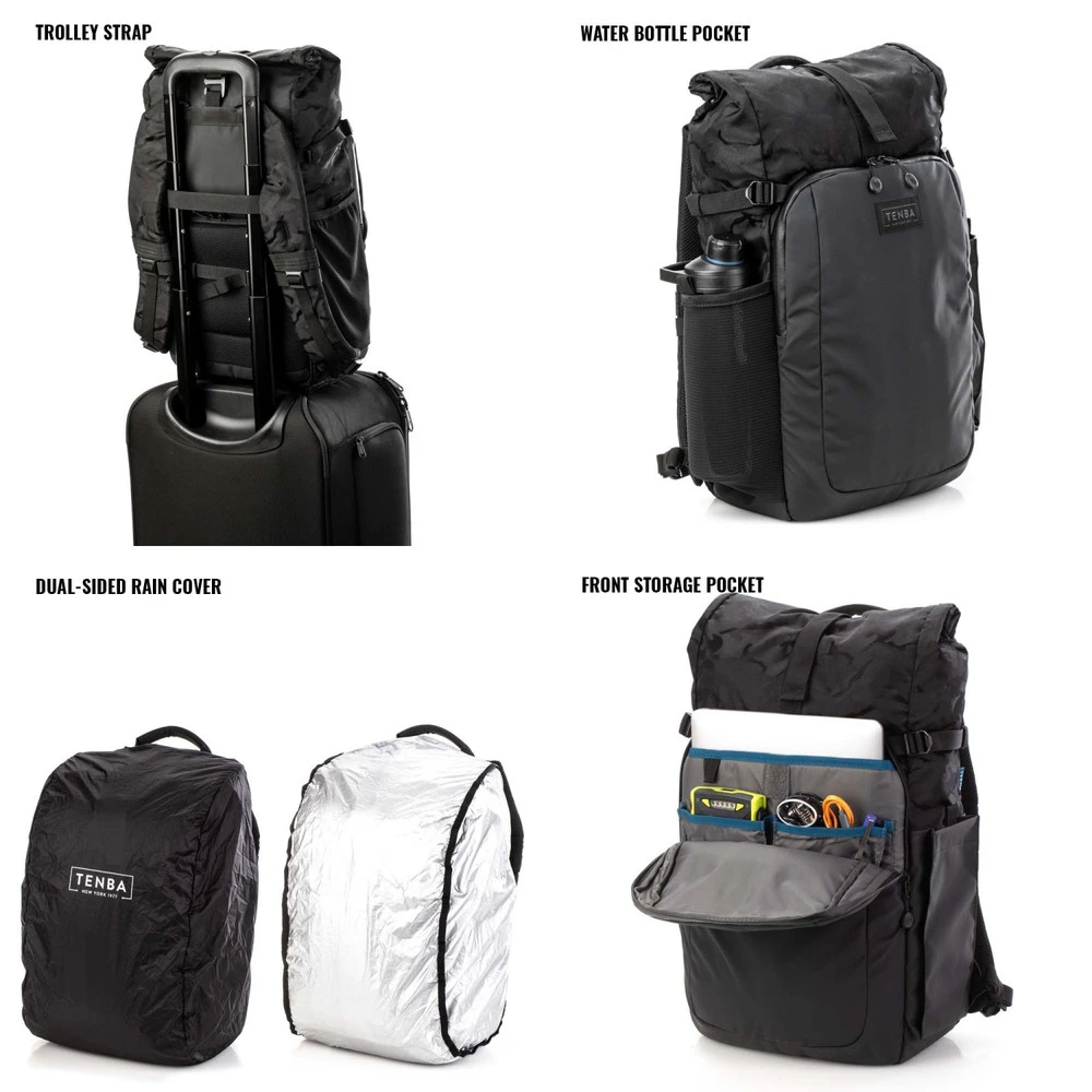 Fulton backpacks combine timeless, vintage style with modern comfort, function and camera protection. Their soft, lightweight canvas design blends seamlessly into any environment, yet they possess a full complement of professional-grade features, such as secure rear camera access, tripod/monopod support, a padded laptop sleeve, and an expandable rolltop opening. The 14L backpack fits a mirrorless or DSLR camera with 3-4 lenses (up to attached 70-200mm 2.8), plus a laptop up to 14 inches (35 cm). It also fits the DJI Mavic and other compact drones. And the top rolltop section has tons of space for food, a lightweight jacket and other personal gear.