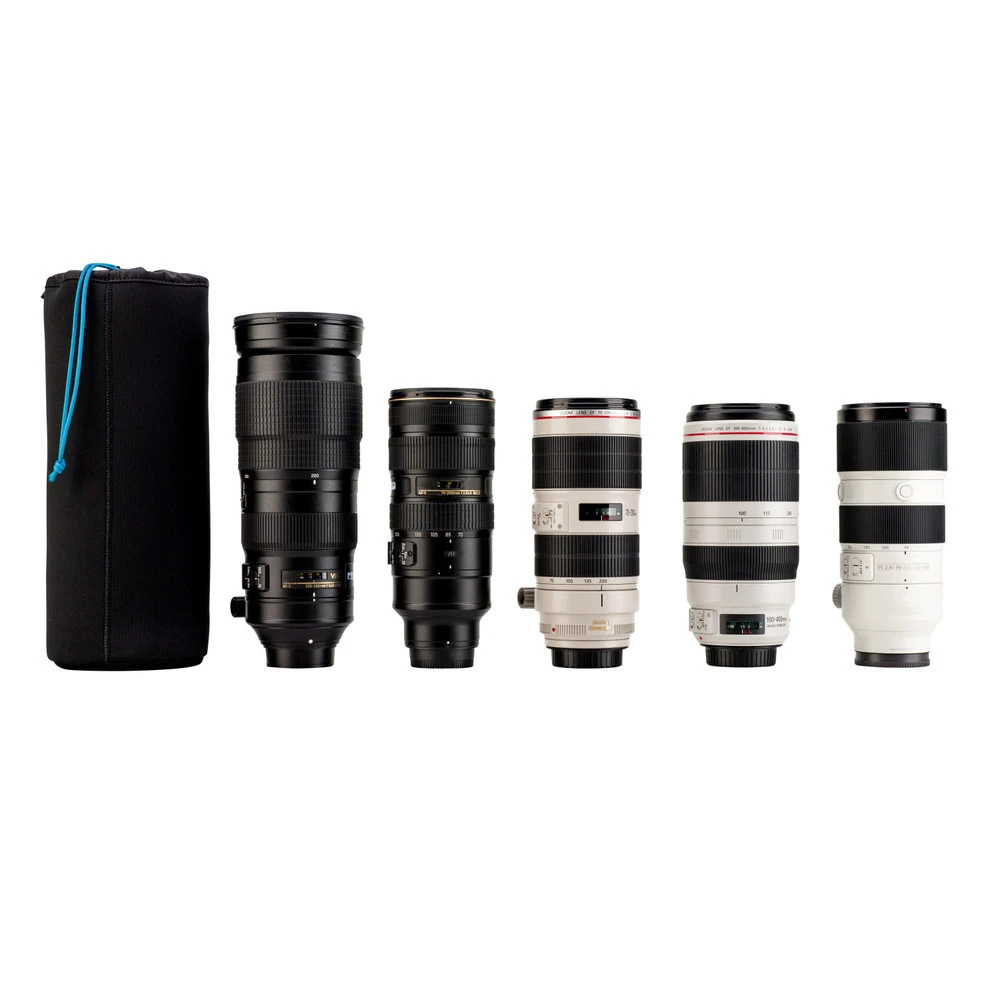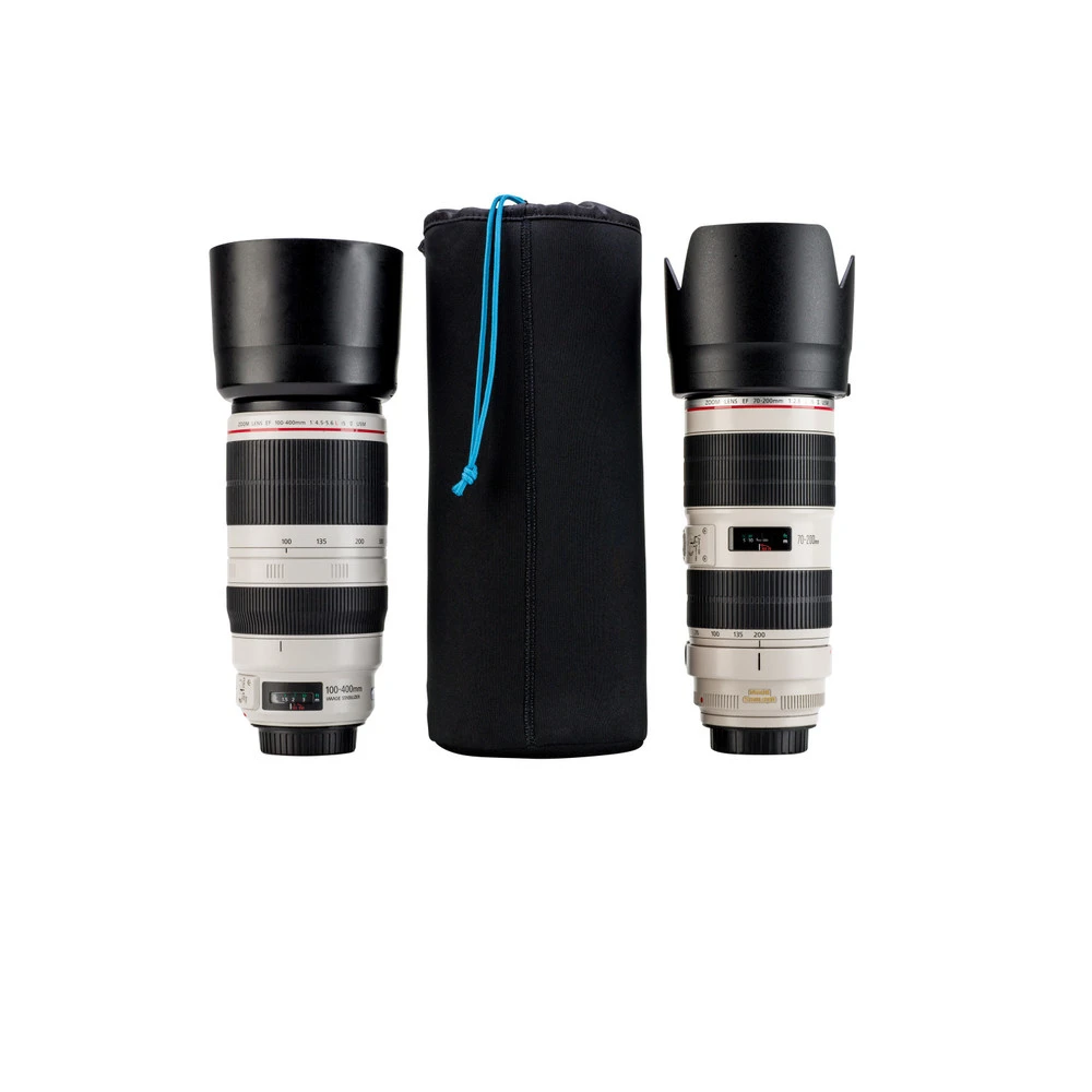 Soft neoprene pouches provide the perfect amount of extra protection for lenses inside a larger bag. The 12×5 in. (30×13 cm) pouch will fit a Canon/Nikon/Sony 70-200mm 2.8 with the lens hood extended, as well as a Nikon 200-500mm and other zoom lenses up to 12 inches (30 cm) in length. The quick drawstring closure cinches over the front of the lens without bunching up, and the lightweight design provides protection without being bulky or heavy.