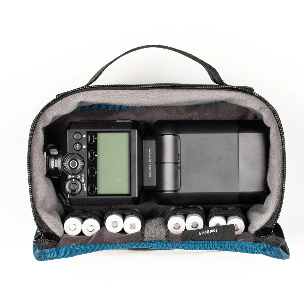The Tool Box is one of the most versatile storage solutions we’ve ever made. It’s the perfect combination of protection and organization for smaller gear such as GoPro®/Action camera systems, compact mirrorless cameras and lenses, camera strobes, microphones and professional audio gear, batteries, cables and accessories. The walls and dividers are made with a layered combination of protective EVA foam and rigid PE board to keep contents safe inside any bag. Gear is always visible at a quick glance through the reinforced TPU window. Elastic loops keep a tight grip on batteries and cables.
