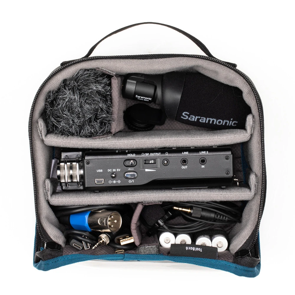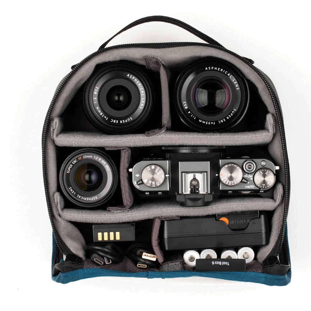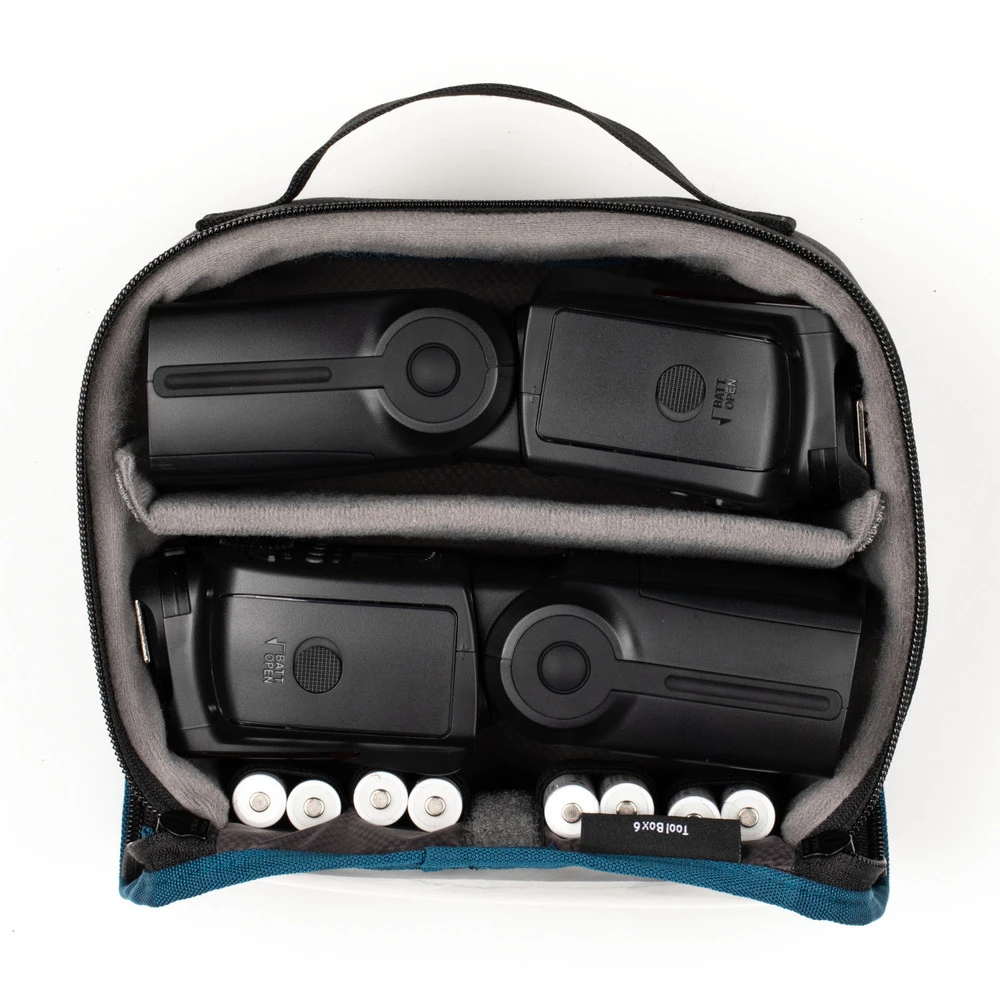 The Tool Box is one of the most versatile storage solutions we’ve ever made. It’s the perfect combination of protection and organization for smaller gear such as GoPro®/Action camera systems, compact mirrorless cameras and lenses, camera strobes, microphones and professional audio gear, batteries, cables and accessories. The walls and dividers are made with a layered combination of protective EVA foam and rigid PE board to keep contents safe inside any bag. Gear is always visible at a quick glance through the reinforced TPU window. Elastic loops keep a tight grip on batteries and cables.